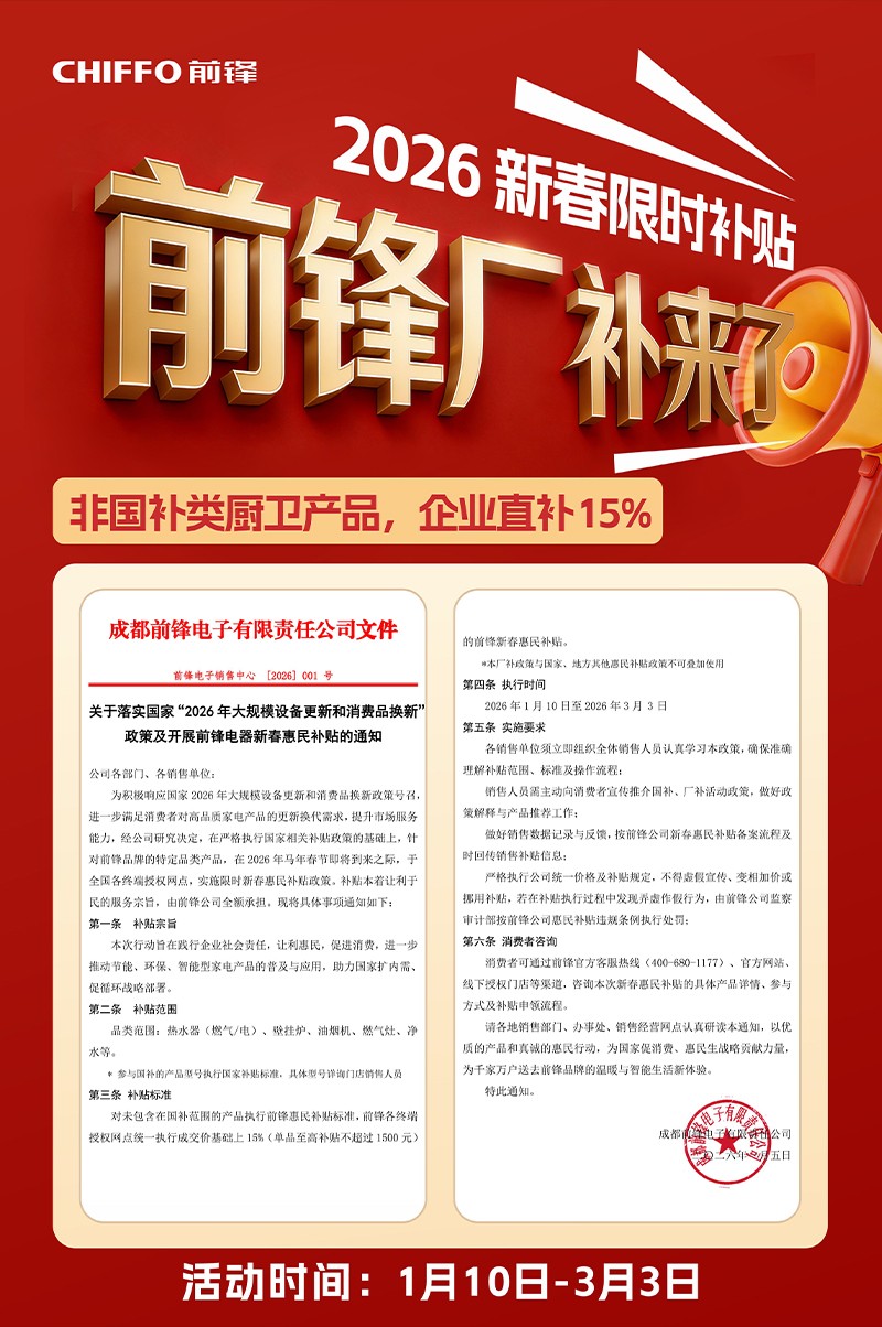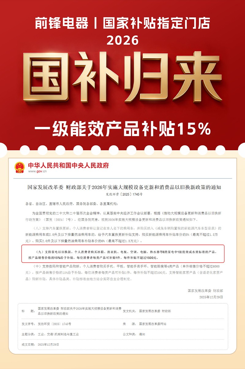 新年焕新,温暖升级,2026年国补政策荣耀回归!前锋再次入选国家指定补贴单位,为您的品质生活助力!更重磅的是,前锋推出“新春厂补”,诚意拉满,补贴不打折、不套路,双线补贴,15%直降,让您一次购齐,暖意全开!