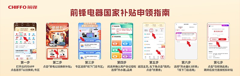 前锋作为您身边“国家认证”的补贴放心站,购买一级能效热水器,可享15%国家直补,流程超简单:
